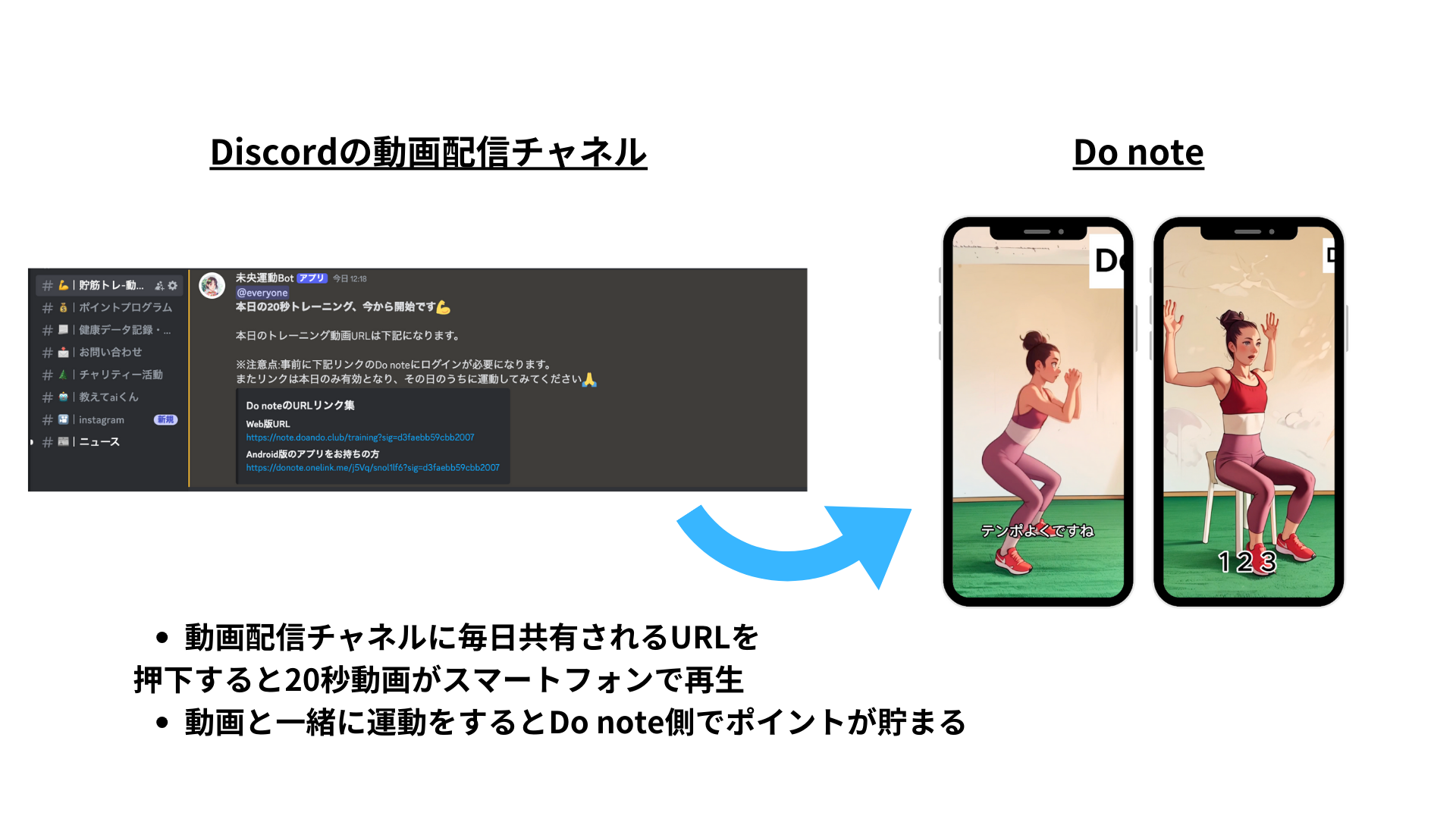 上述のDo noteと世界中で1.5億人以上の方が利用するDiscordアプリを利用して、2024年7月からポイントプログラムの仕組みの提供を開始しました。Discordはコミュニケーションのプラットフォームであり、Discordのチャット機能を用いた情報発信を当社から行うことで、すぐにお客様側の方でアクションが取れるような機能設計になっています。具体的に言うと、20秒のアニメーション動画が再生できるURLの告知をDiscord上で行い、そのURLをクリックすると動画再生がDo note上で開始され、動画と一緒に運動後にポイントが付与される仕組みとなっています。