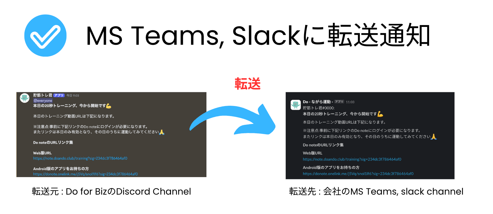 すべての人に健康意識と社会貢献意識の定着を目指すサービス「Do」を展開しているDo&Do. 株式会社(本社 : 東京都渋谷区、代表取締役 : 菊池佑太 以下当社) は法人向けサービス「Do for Biz」において、従業員の皆様が健康を向上させる活動をサポートするコンテンツをこれまでDiscordで配信してきました。しかし、法人の従業員がDiscordに登録・参加するための社内手続きが複雑であるため、その障壁を下げるための代替手段として、Discordでの配信コンテンツをMicrosoft TeamsやSlackの企業内メッセージルームへ転送する機能を新たに提供開始しました。これによりお客様が普段お仕事で利用されているメッセージルームの1つを健康配信チャンネルとしてご利用いただけるようになりました。