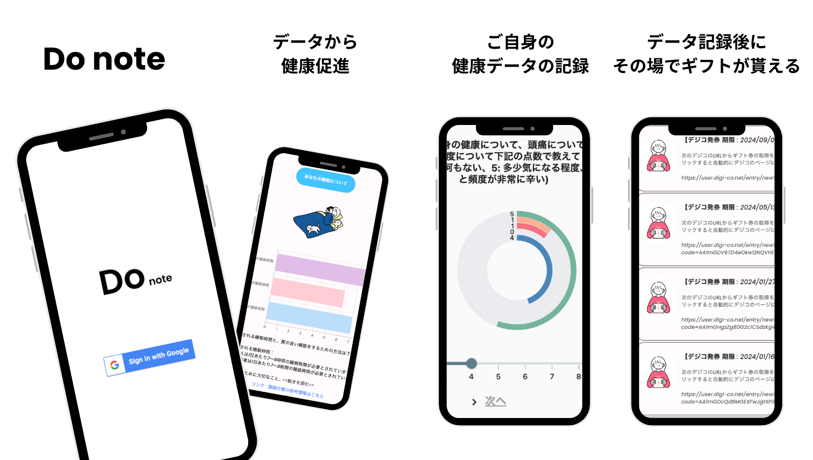 健康データが記録されると、ポイント取得、もしくはリアルタイムでデジタルギフト謝礼をDo note上に配布