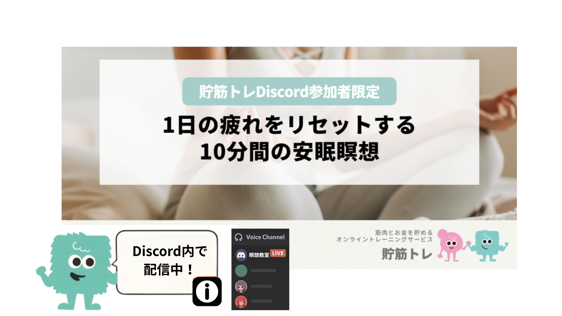 上記プログラムに追加し2025年1月より、オンラインイベントを担当している運動トレーナーのボイスチャンネルの配信を開始しました。お休み前の瞑想をテーマとし、ラジオ感覚と実践形式を楽しめる1回約10分のコンテンツ配信をしています。ボイスチャンネルは全てDiscordで配信していますので、下記URLよりご参加ください。